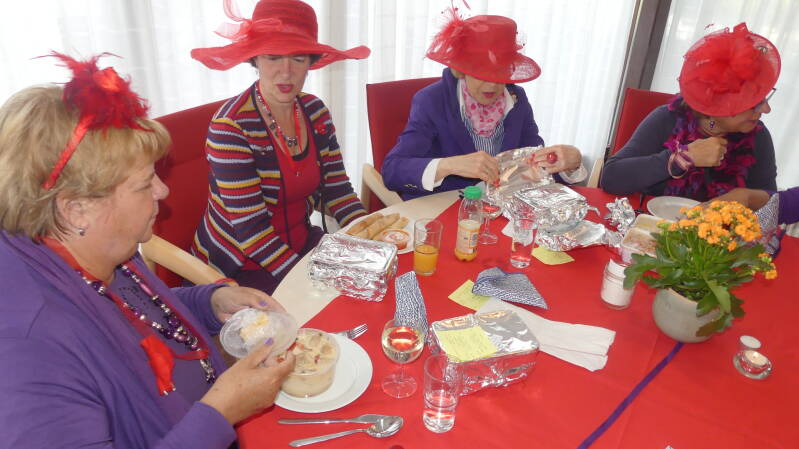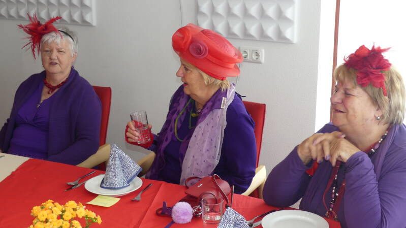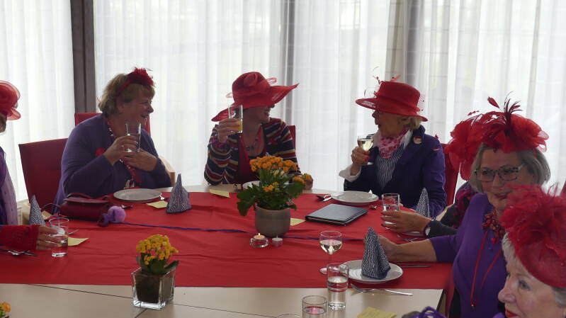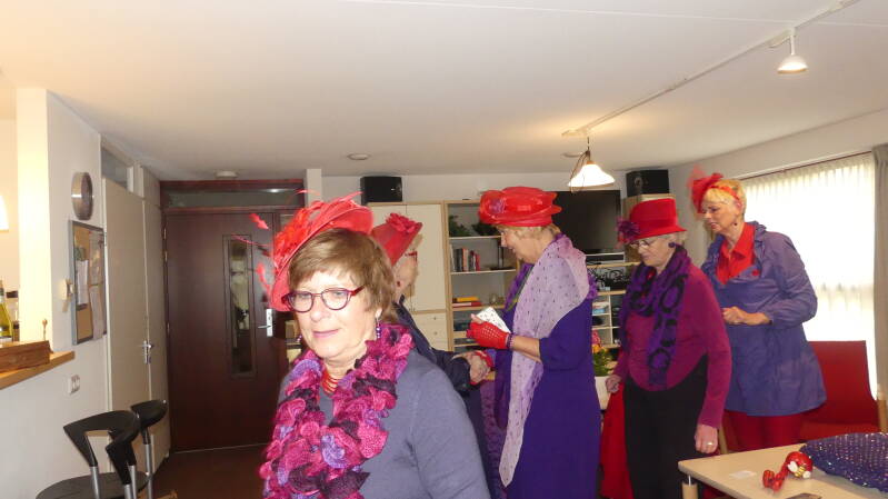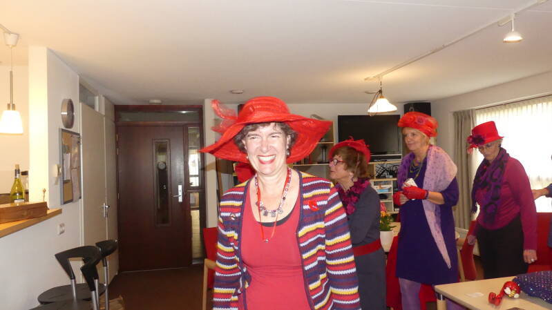 waarna de Debubij- na bevestigend geantwoord te hebben op een aantal vragen - de Red Hat Society pin opgespeld krijgt.