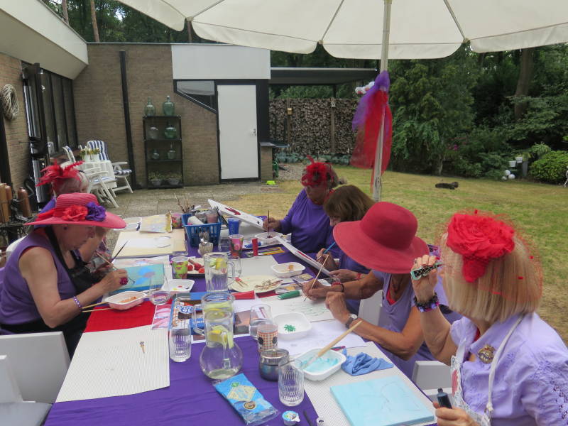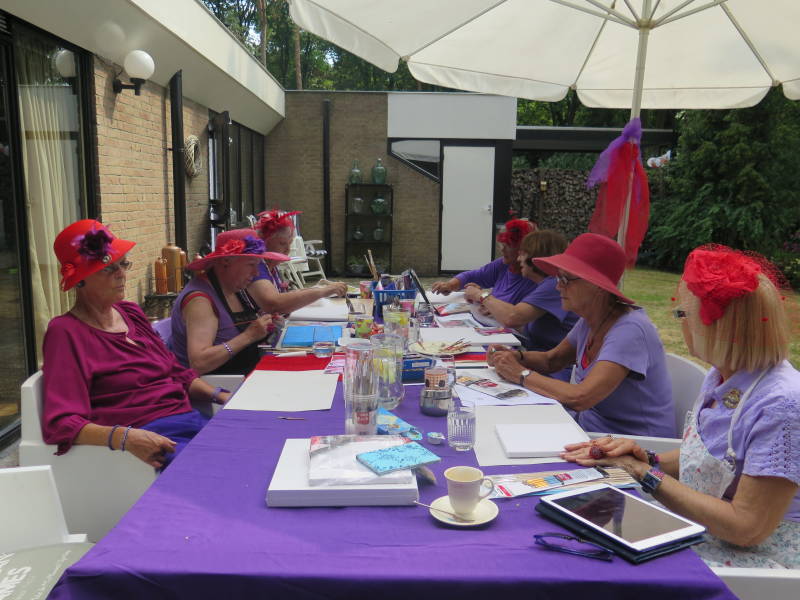 Eerst hebben we gezellig Bijgepraat en een lekker zoetigheidje genoten en daarna werd het hard werken. Voor nog meer steun zorgde de buurvrouw van Marquerite. Zij was duidelijk een ervarings deskundige. Zij gaf goede tips en zorgde ervoor dat wij het idee kregen om toch iets leuks op het doek te kunnen zetten.