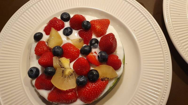 We sluiten laat de dag af. De meeste Bijtjes eten nog een halve pizza en een pizzapunt toetje van meloen mooi vers fruit en amandelyoghurt gemaakt door Philyne.